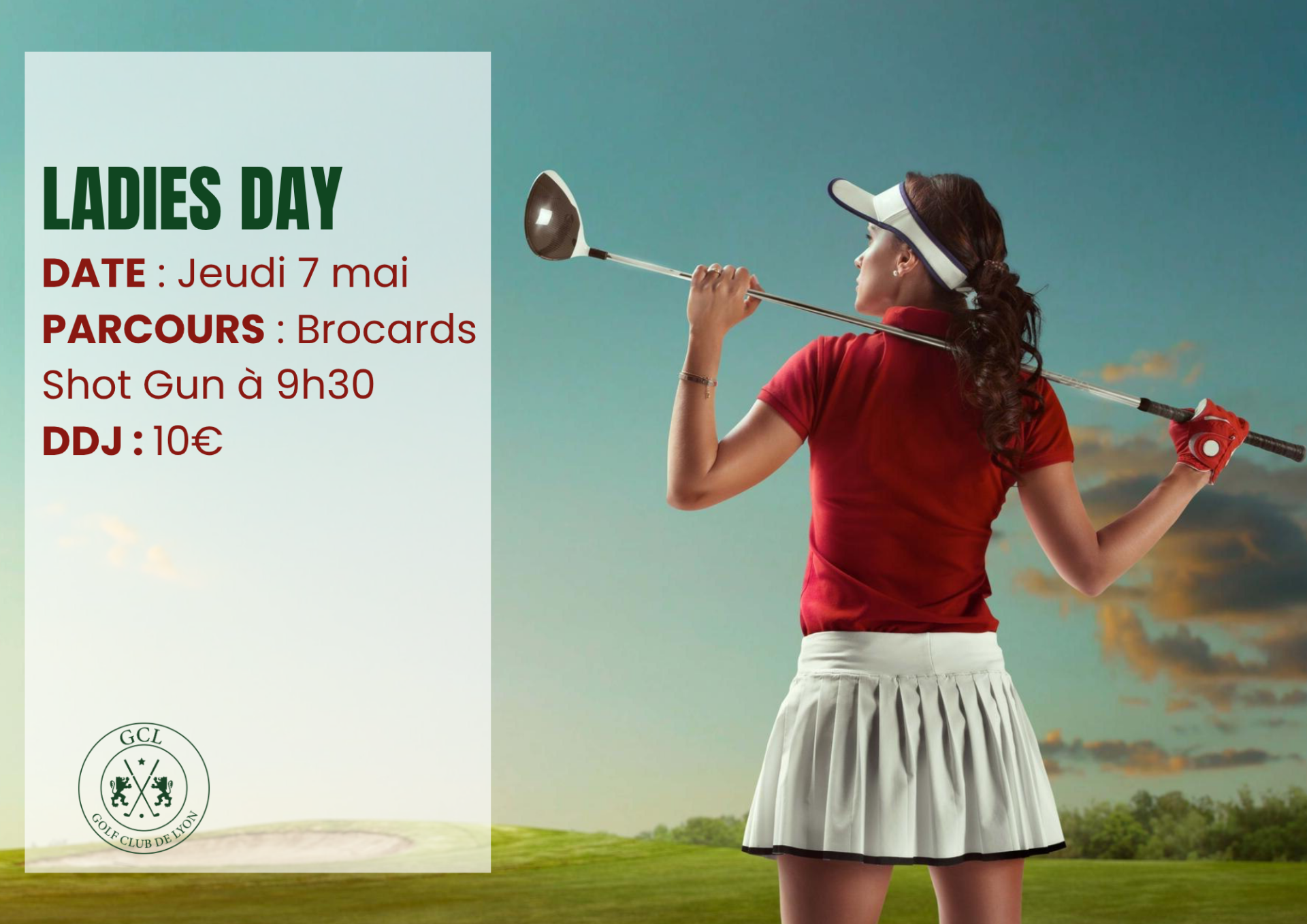 Publié le 20 avril 2026 Chères golfeuses, Nous avons le plaisir de vous annoncer l’ouverture des inscriptions pour la Ladies Day, le jeudi 7 mai. La compétition se jouera sur le parcours des Brocards, avec un départ à 9h30, en shotgun